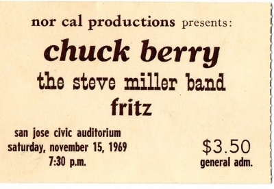 Chuck Berry hired different bands at each of his concerts. We here hired to back him up this night. After three encores, he told us we really rocked. Quite an honor. Fritz was a short lived band with Lindsey Buckingham and Stevie Nicks.